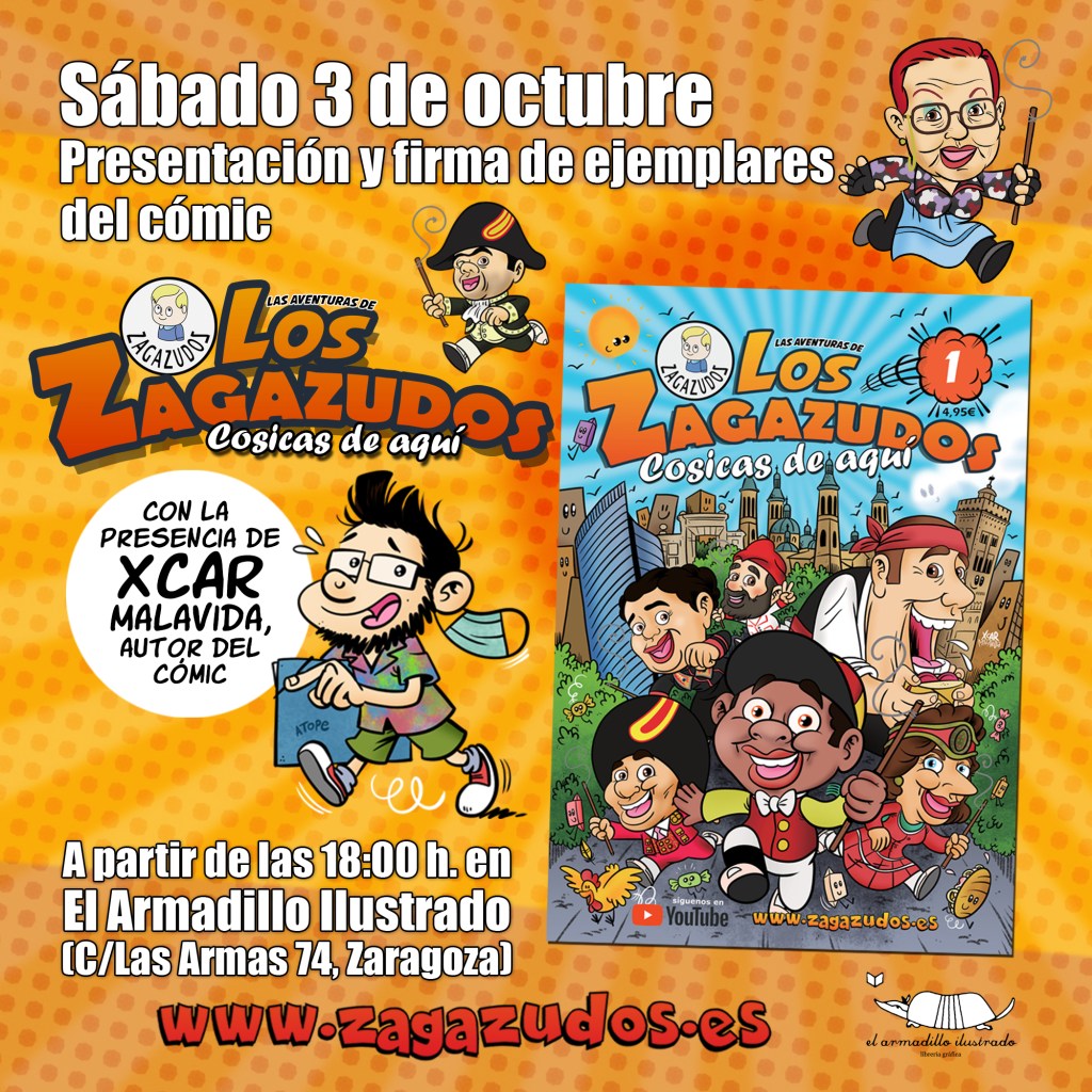 El próximo sábado 3 de octubre estaré en la librería El Armadillo Ilustrado (C/Las Armas 74, Zaragoza) presentando y firmando ejemplares de mi nuevo tebeo sobre los cabezudos: «Los Zagazudos. Cosicas de aquí». También firmaré ejemplares del resto de mis publicaciones. La cosa será a partir de las 18:00, ¡os esperamos! Más información en www.zagazudos.es