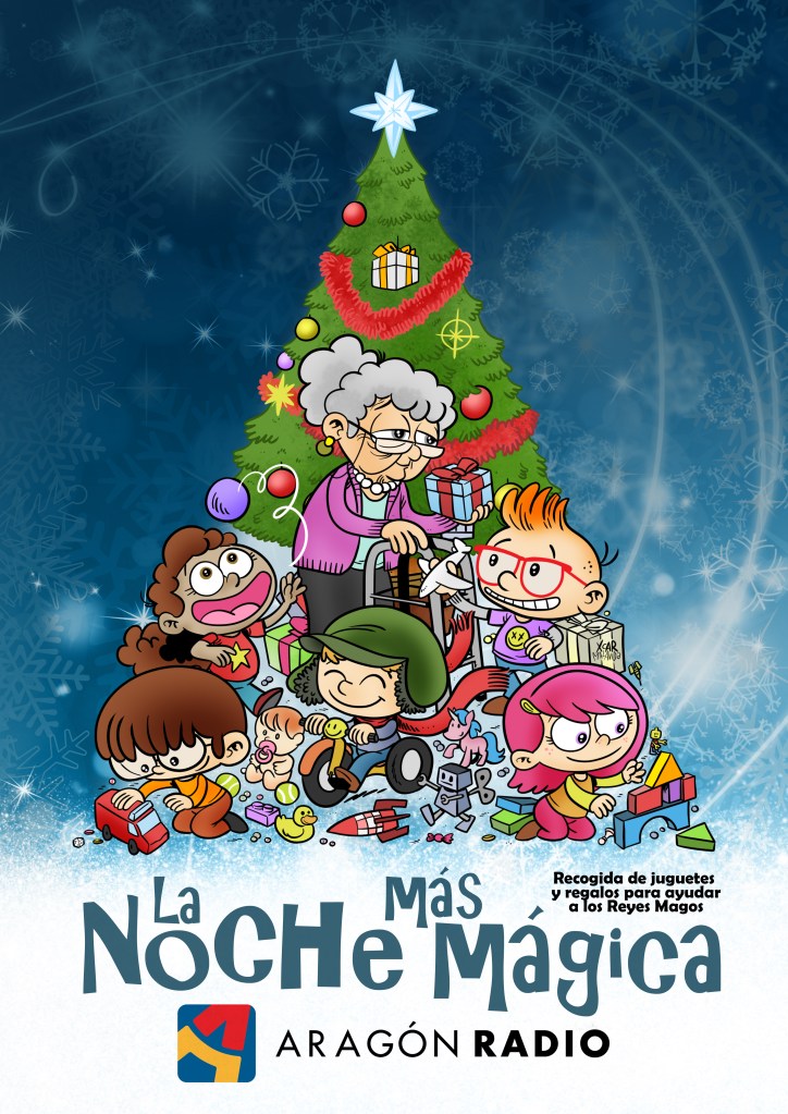 He hecho este cartel para la iniciativa solidaria «La noche más mágica» de Aragón Radio. Se trata de una iniciativa que pretende conseguir que los niños y ancianos más desfavorecidos de la comunidad tengan un regalo en la Noche de Reyes. Queremos que tus donaciones lleguen a El Refugio en Zaragoza, Cáritas en Teruel y los Hermanos de la Cruz Blanca en Huesca. Colaborar es fácil, solo tienes que llevar tu regalo a un punto de recogida. Buscamos juguetes nuevos o en buen estado y regalos para personas mayores. Tenéis toda la información aquí.