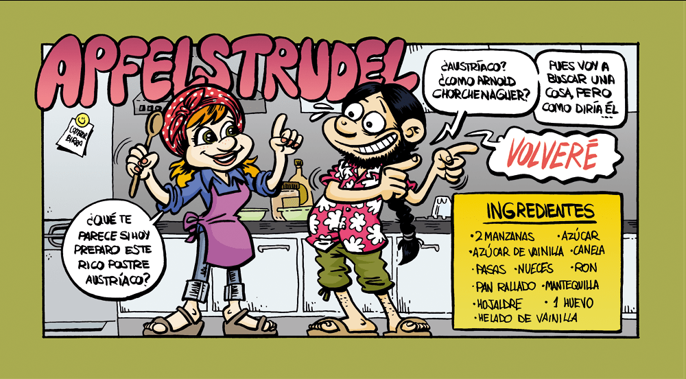 Sigo colaborando con el programa de cocina de Aragón Radio «De boca en boca», contando las recetas que salen en mis tebeos de cocina «Estoy hecho un cocinicas», «Sigo siendo un cocinicas» y «Todos somos cocinicas». Esta semana cuento cómo hacer un rico postre austríaco, el apfelstrudel. ¡Riquísimo!
