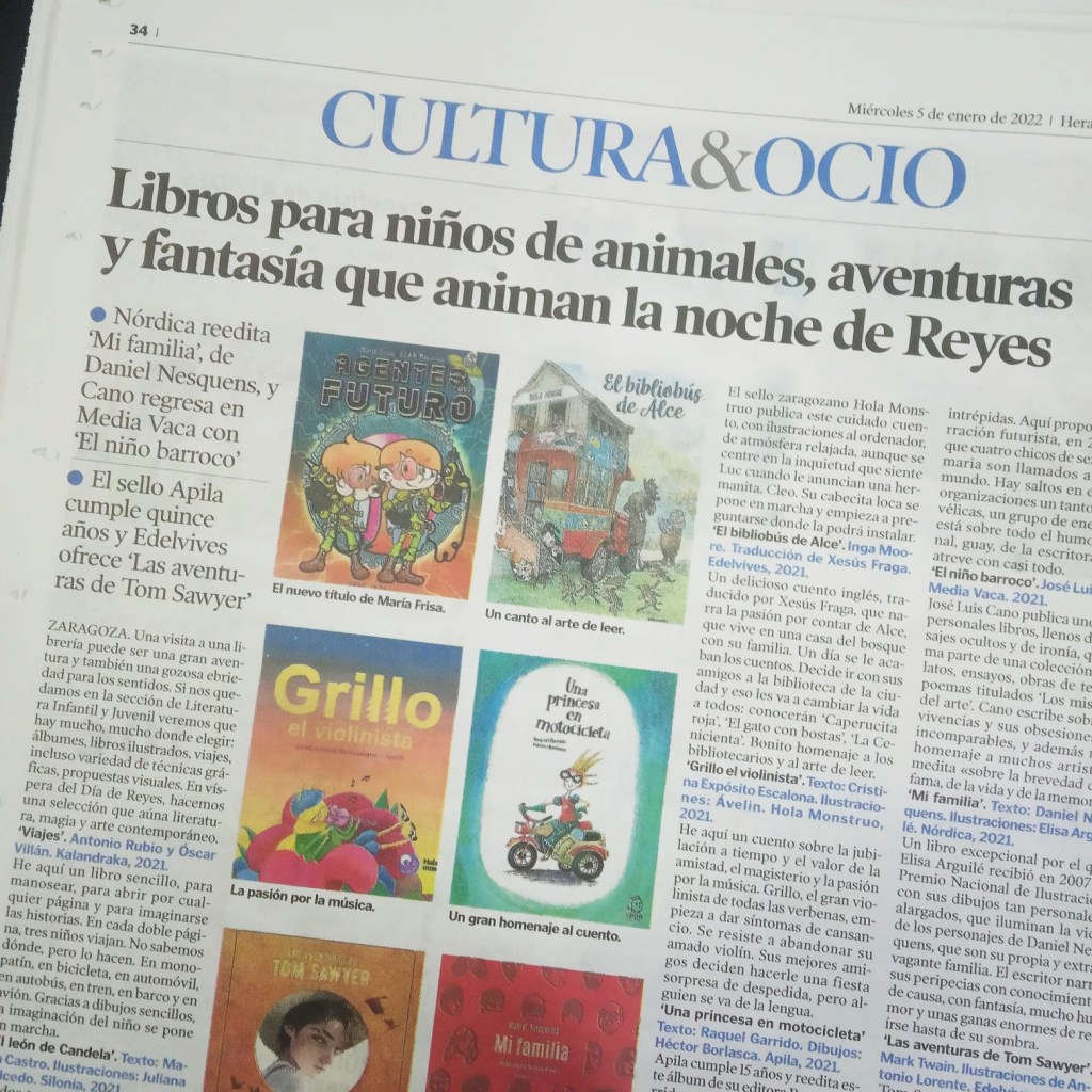 Hoy en Heraldo de Aragón Antón Castro recomienda algunos libros para pedir a los reyes entre los que destaca «Agentes del futuro», de María Frisa y un servidor. ¡Espero que esta noche los reyes os traigan muchos libros y tebeos! Y si son de los míos mejor, que ya sabéis que el chalet en la sierra no se paga solo. ¡A tope!