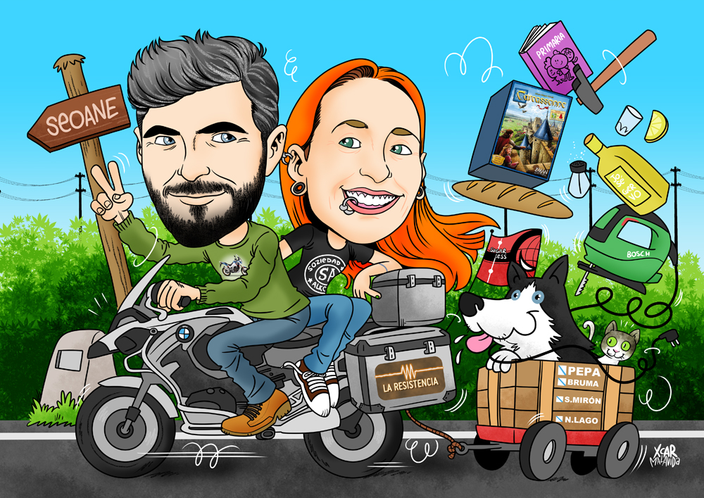 Caricatura de una pareja de moteros a los que les molan los juegos de mesa, viajar, el tequila, hacer bricolaje, sus animaletes, y mil cosas más.