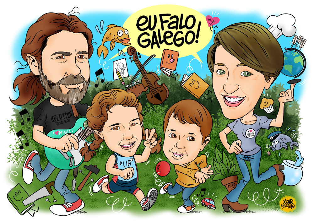 Caricatura de una familia gallega a la que le encanta la música, la biología, correr, jugar a la pelota, cocinar, leer,…
