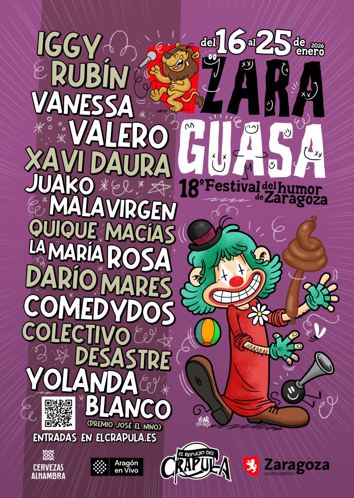 Y el último cartel que hago este año es el de ZARAGUASA, el 18º Festival del humor de Zaragoza. Del 16 al 25 de enero de 2026 y con un plantel de artistas de los de quitarse el sombrero. ¡No os lo perdáis que va a ser la repera!