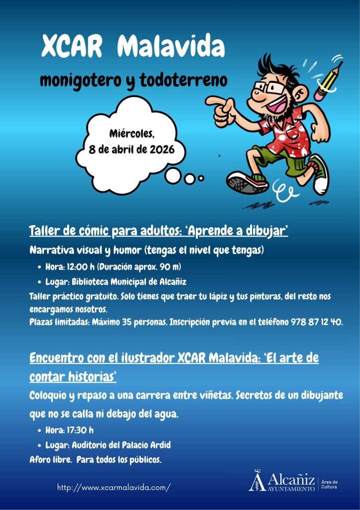 El próximo miércoles 8 de abril voy a pasarme el día enterico dando la chapa en Alcañiz. Primero daré un taller de cómic para la chavalería, luego otro para adultos, y por la tarde participaré en un encuentro en el que contaré un montón de anécdotas sobre mi extensa carrera. Ah, y luego firmaré ejemplares de mis libros y tebeos. Todo será en la biblioteca de Alcañiz, y además es gratuito.