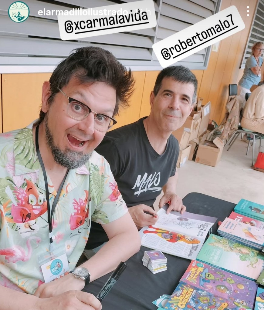 Ayer en la feria del libro del cole Arcosur firmé 125 libros en unas tres horas y media. Eso hace firmar un libro (con su correspondiente dibujico) cada minuto y cuarenta segundos. No sé si soy el dibujante más rápido del oeste pero por ahí andará la cosa 🤣🤣😊Muchas gracias a toda la buena gente del cole Arcosur por tratarme tan bien y por recibir mi trabajo con tanto cariño. Habían decorado el patio con dibujos de mis personajes y la chavalería ayer no paró de venir a traerme cariño y regalos (me trajeron dibujos y tebeos que habían hecho ellos sobre mi y mis personajes, y varias cosas más). También decoraron todo el cole con los 23 cómics gigantes que he estado haciendo estos días con todo el alumnado de primaria. ¡Menudas maravillas hemos hecho!Y gracias también a los amigos de Librería El Armadillo Ilustrado por invitarme ayer a firmar con ellos. Y al colega Roberto Malo, que también firmó un montón de Supermalas.Y, a todos los que os quedasteis sin mis libros de la caca (agotamos todos los ejemplares que llevamos a mitad de feria) os recuerdo que mañana día 23 de abril se celebra el día del libro y que estaré todo el día firmando ejemplares de toda mi obra en el puesto del Colectivo Malavida/Editorial Cornoque (en Paseo Independencia esquina con Zurita).¡Viva la chavalería! ¡Vivan los tebeos! Postdata: no me dio tiempo a hacer ni una triste foto, ya lo siento. Solo tengo esta que nos hizo Víctor a Roberto Malo y a mí, entre firma y firma 😍