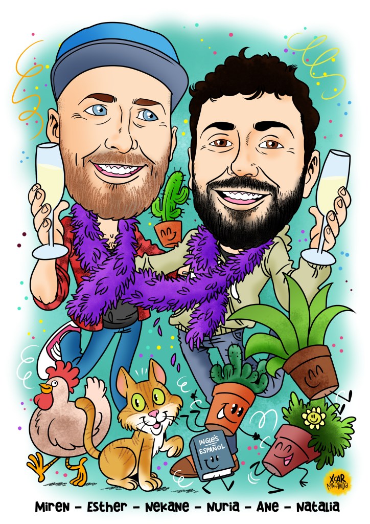 Natalia y sus amigas me pidieron esta caricatura para celebrar la boda de sus amigos José (veterinario de gallinas ponedoras) y James (profe de inglés). ¡Sed muy felices, pareja!