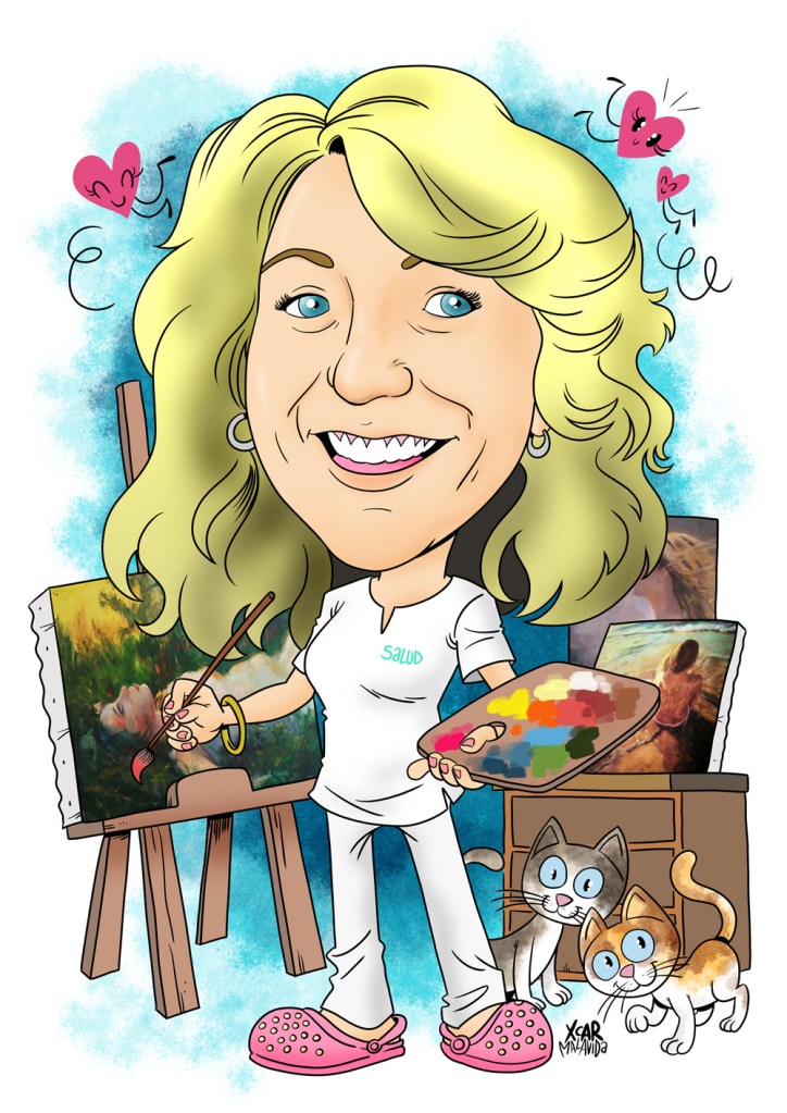 Begoña Fidalgo me pidió esta caricatura de su amiga Inma para tener un detallazo con ella. Inma es sanitaria y le encantan los gatos. ¡Y pintar! Si tú también quieres hacerle un regalo como éste a tu amiga Maripuri, pídemelo -mejor si es con educación- y lo hablamos.