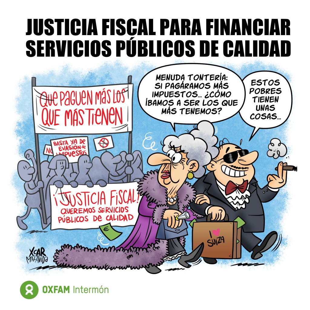 ¡Justicia fiscal para financiar servicios públicos de calidad!Otra viñeta realizada para Oxfam Intermon hablando de un tema que -una vez más- está de rabiosa actualidad (si en el maletín hubiera puesto Andorra en vez de Suiza también habría valido, ¿no?).