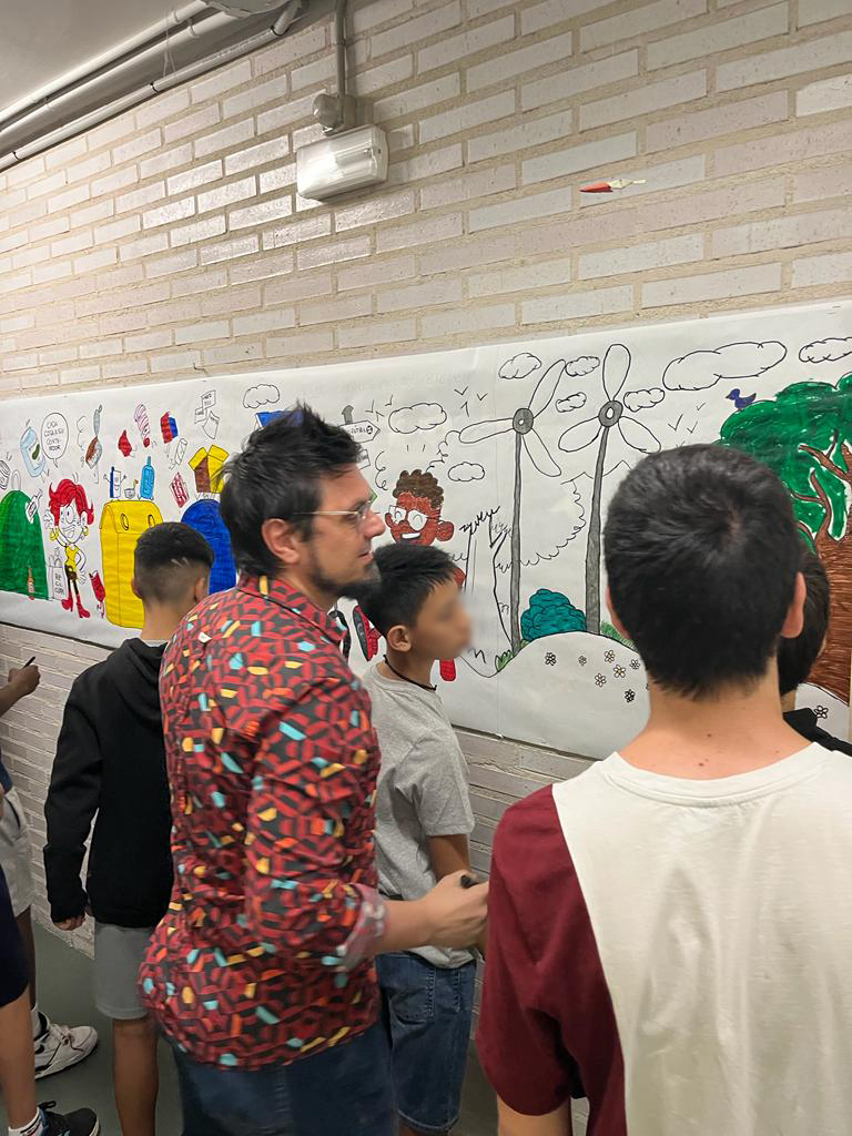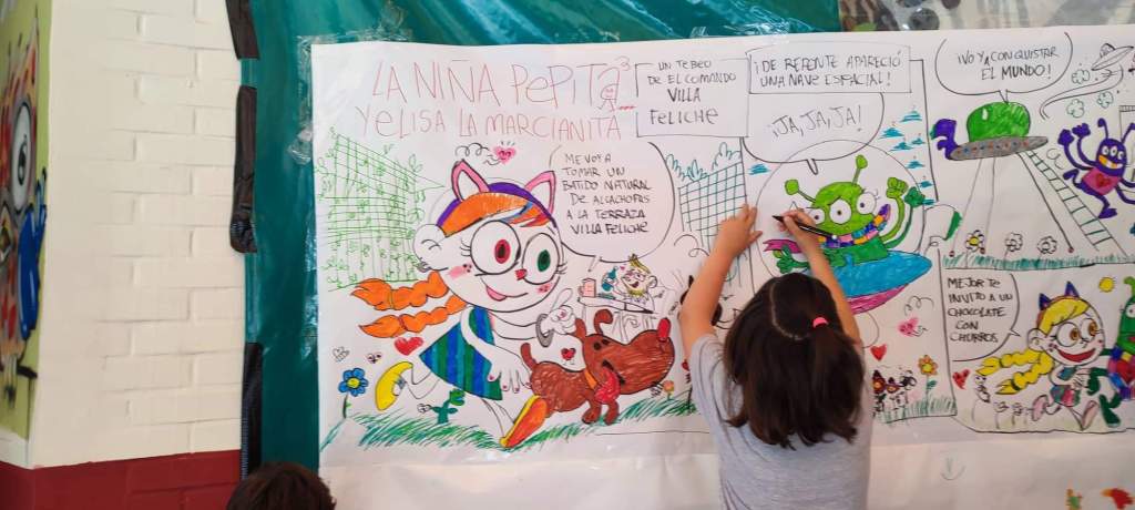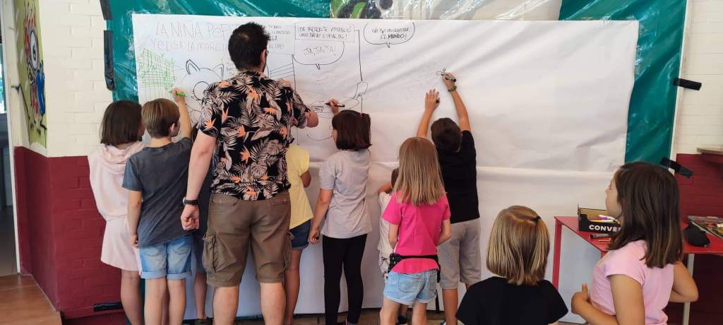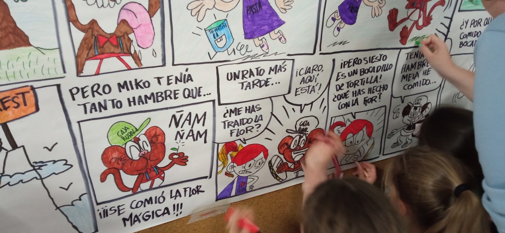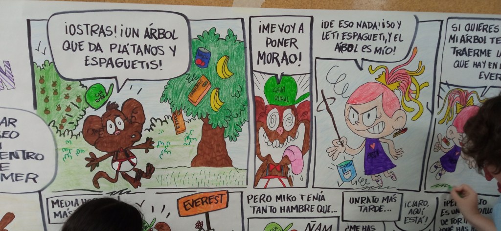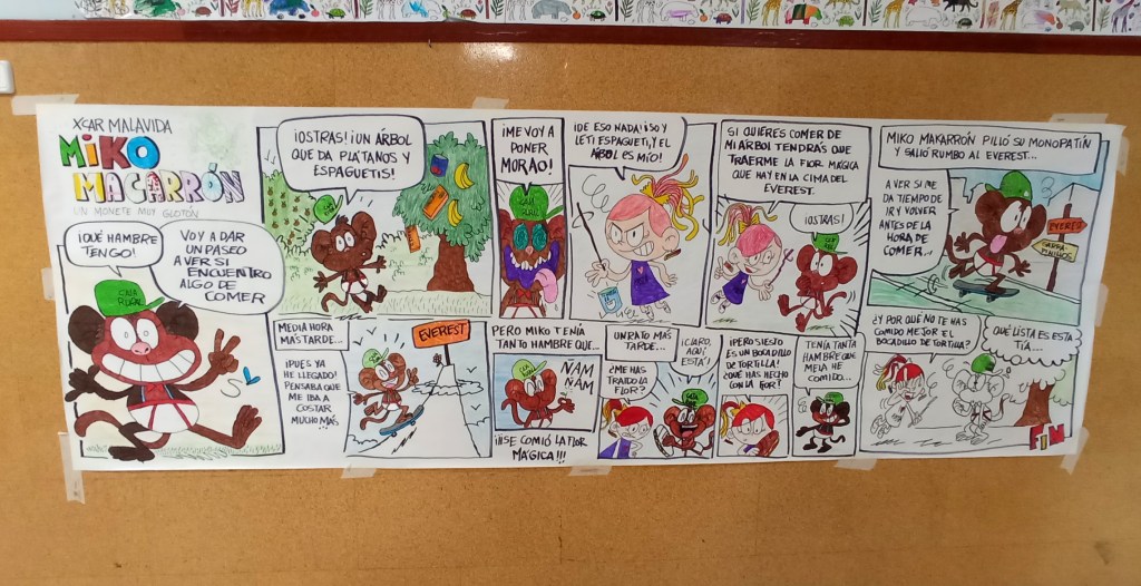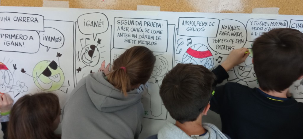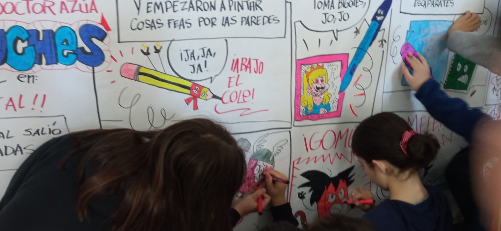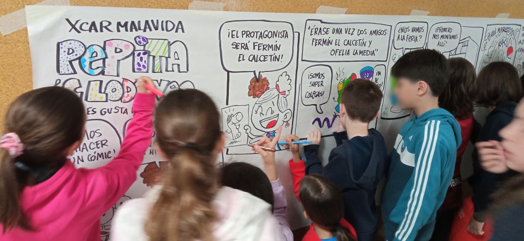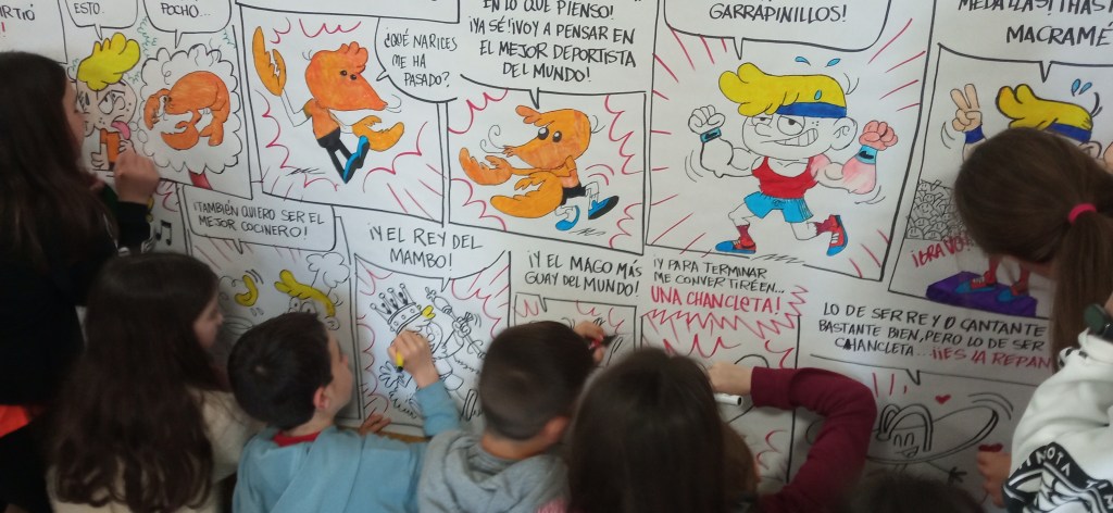 Ayer estuve dibujando con la chavalería de primaria del cole Doctor Azúa de Zaragoza. Estuve con tres clases (6º A, B y C), y nos marcamos un cómic gigante chulísimo entre todos.