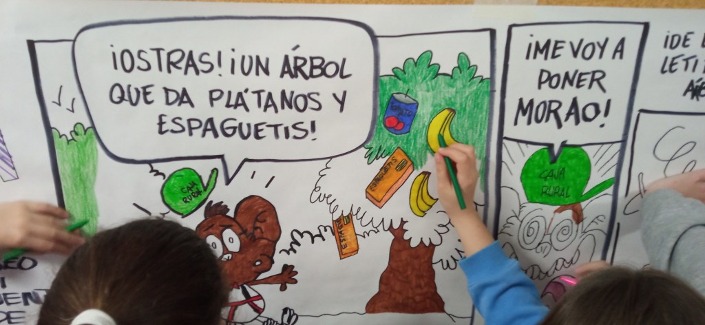 Pensamos un personaje (en este caso el tocino Marcelino), fuimos pensando la historia (le regalan un gorrocóptero por su cumpleaños) y nos fuimos inventando sus peripecias. Yo iba haciendo los bocetos a lápiz y la chavalería los iba repasando, coloreando y aportando detallicos. ¡Atiende qué maravilla nos marcamos la clase de 6ºC y un servidor!