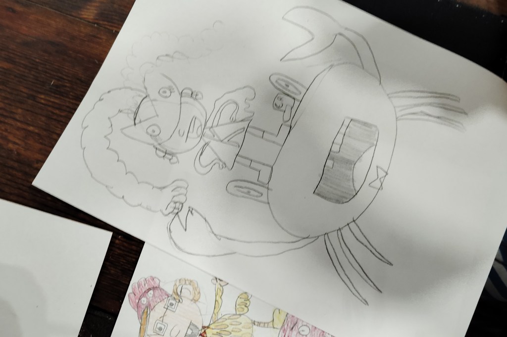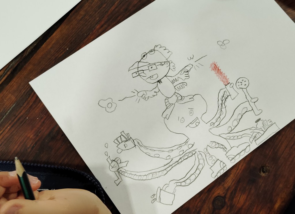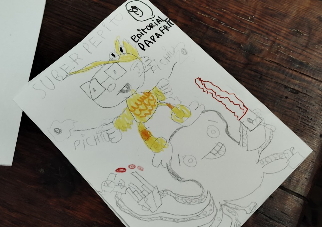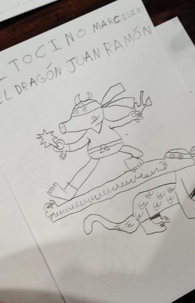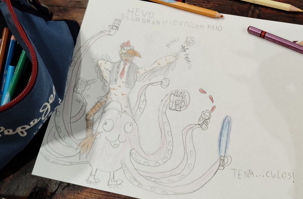 Ayer estuve dando un taller de dibujo en El laboratorio de sueños (C/ San Pablo 12, Zaragoza). Estuvimos inventando superpersonajes montados en animales: un niño con traje de pollo que tiene el poder de disparar huevos fritos con sus dedos y que va montado en un pulpo, una superchica que controla su melena y viaja sobe un cangrejo y un tocino ninja subido a un dragón. Muchas gracias por venir, ¡lo pasamos en grande!