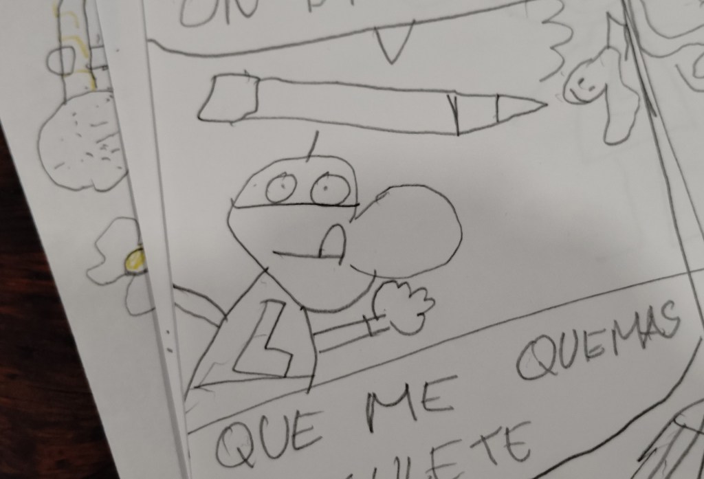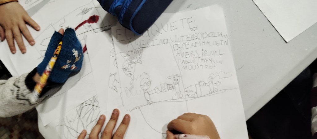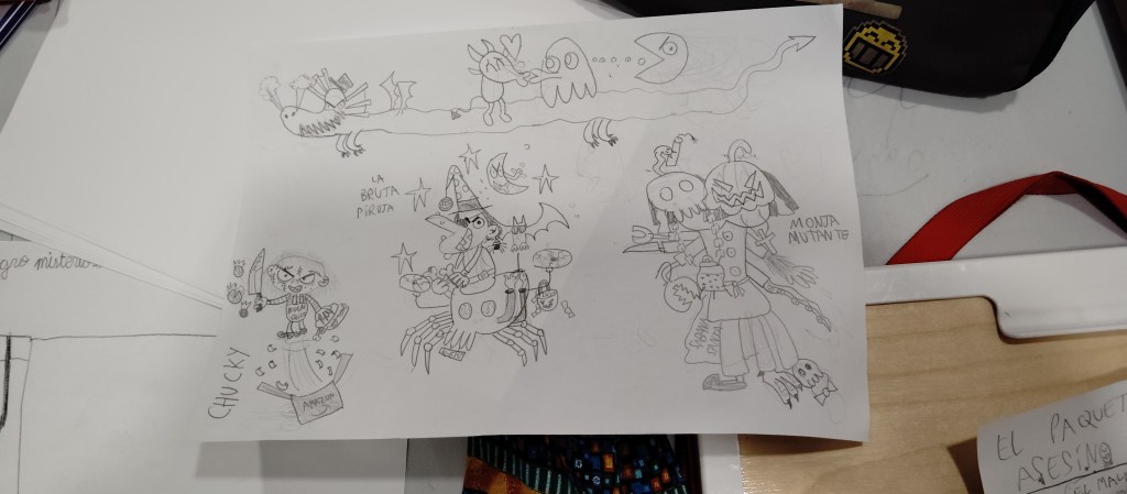 Este mes he empezado a impartir un curso de cómic en Huesca. Voy todos los jueves, y tengo dos grupos: uno para la chavalería de entre 8 y 14 años y otro entre 15 y 25. En total vamos a hacer ocho sesiones (llevamos tres) y el plan es acabar haciendo un fanzine con cada grupo.