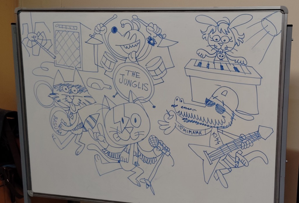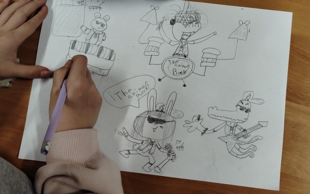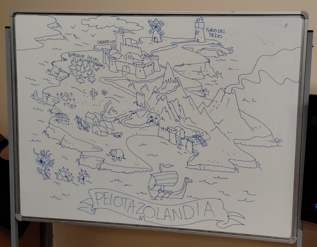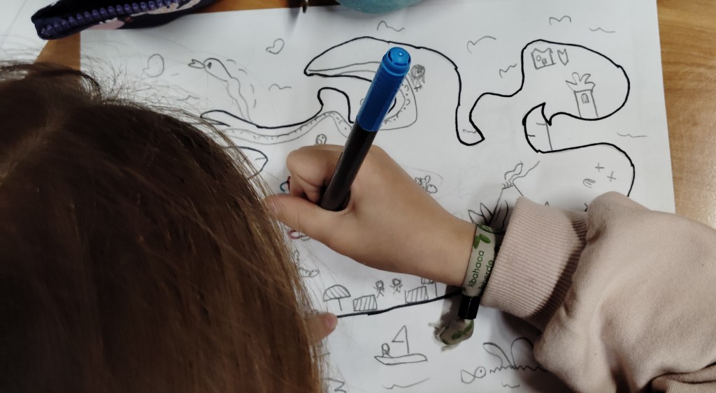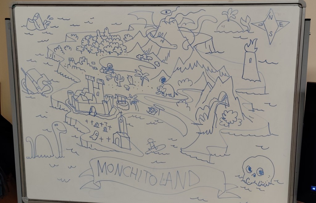 Ayer estuvimos dibujando un grupo de rock de animales (con los peques) y nos invantamos un mapa de un mundo de fantasía (eso ya lo hicimos los dos grupos).