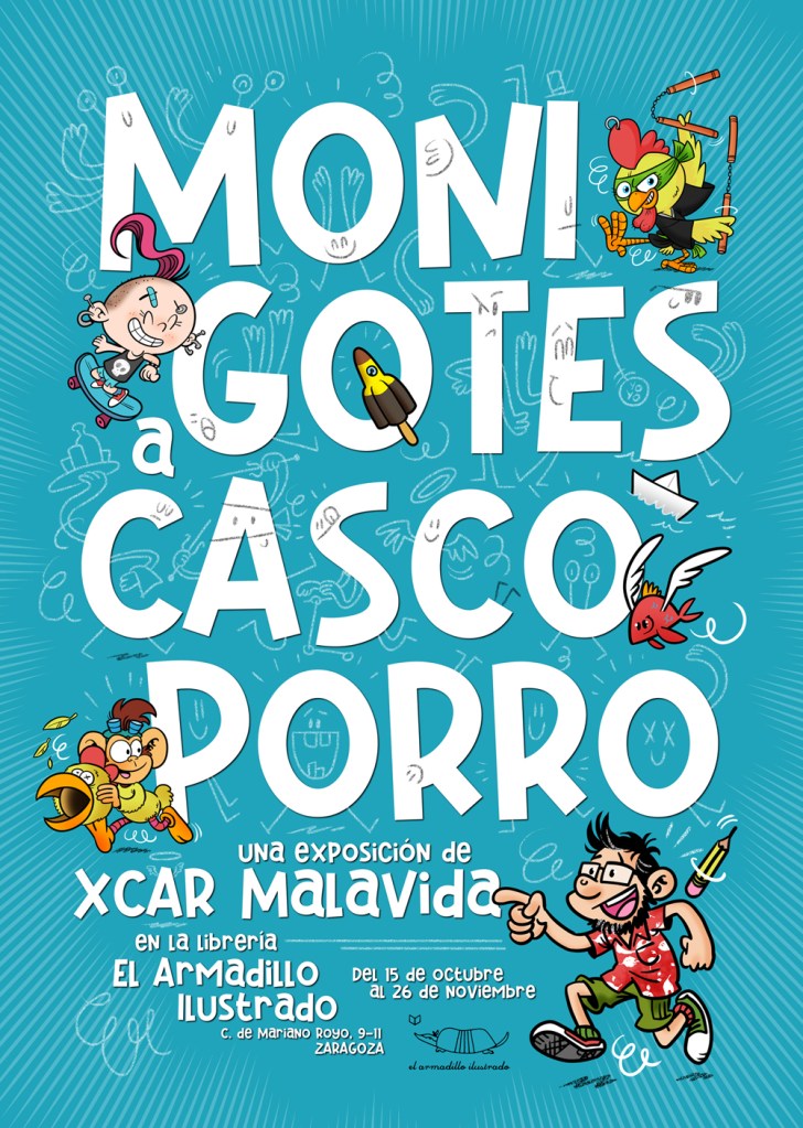 2-En la librería El Armadillo Ilustrado está mi exposición «Monigotes a cascoporro», en la que podéis ver un montón de mis monigotes. ¡Y de paso comprar alguno por solo 15 euros! No os lo penséis mucho que se acaba mañana. En la Calle Mariano Royo 9-11 de Zaragoza.