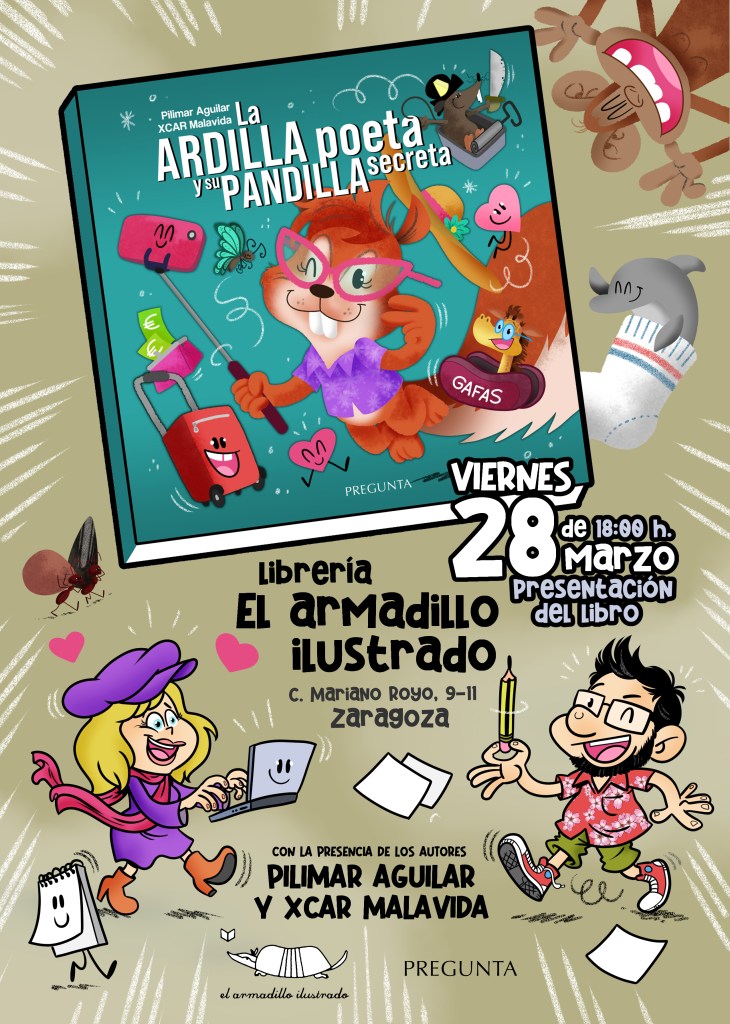 Ayer estuvimos Pilar Martinez Aguilar y yo con Ana Segura Anaya, la fotógrafa oficial de la literatura aragonesa. Y nos retrató así de guapis con nuestro último libro juntos: «La ardilla poeta y su pandilla secreta».